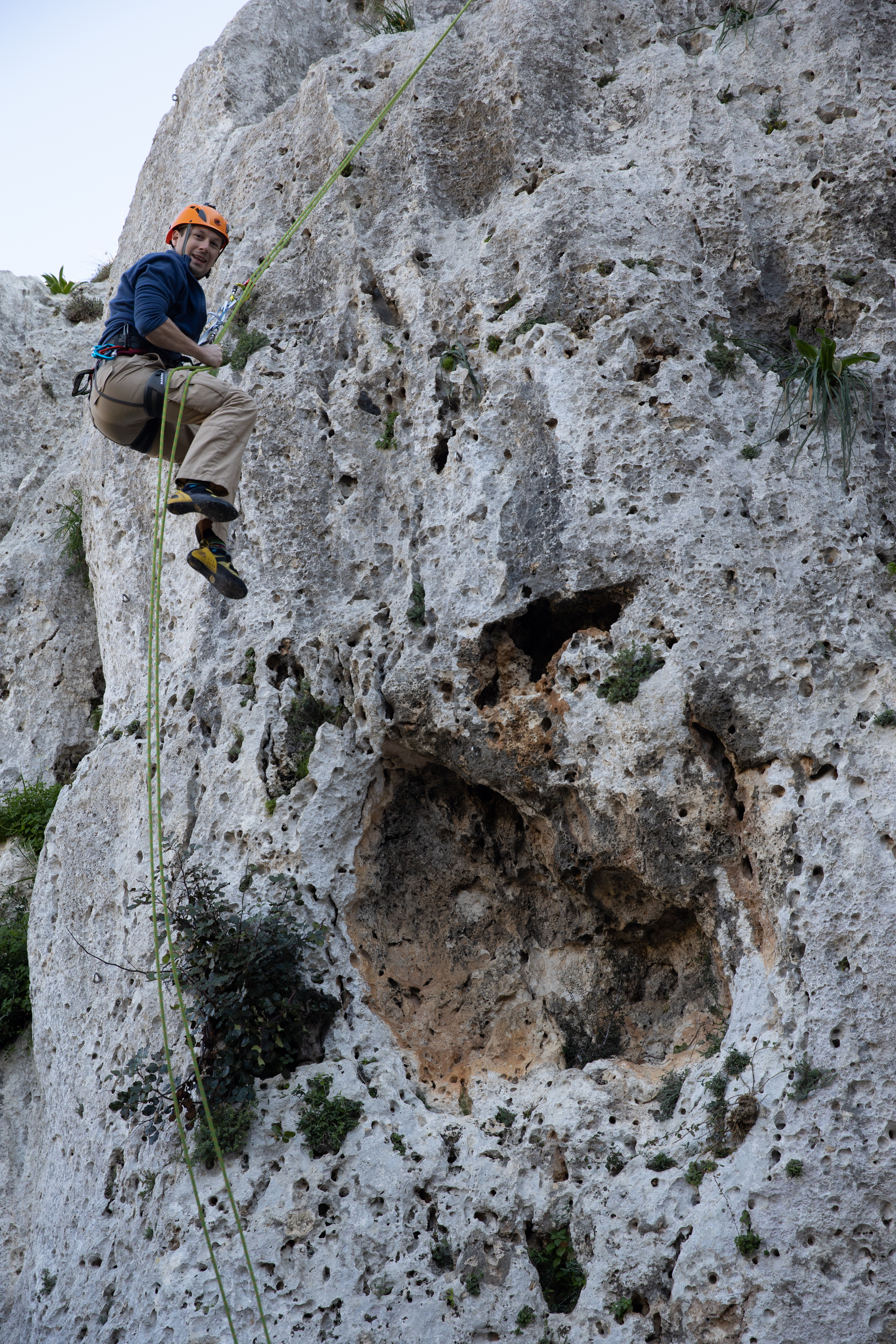 Nordwestlich von Malta liegt die Insel Gozo. Diese ist ebenfalls ein optimales Klettergebiet. Nach der Überfahrt mit der Fähre haben wir das Klettergebiet gesucht. Ohne Kletterguide, der zufällig mit einer Gruppe unterwegs war, wäre der Zustieg um einiges komplizierter gewesen, da wir nicht so recht wussten, wo unser Ziel liegt. Nach einem hin und her haben wir aber gute Felsen gefunden und hatten unseren Spaß. Nach der Mittagspause und einem Käffchen haben wir uns die Ruinen des Azure Windows angeschaut und den Abend beim Genießen des Sonnenuntergangs ausklingen lassen.