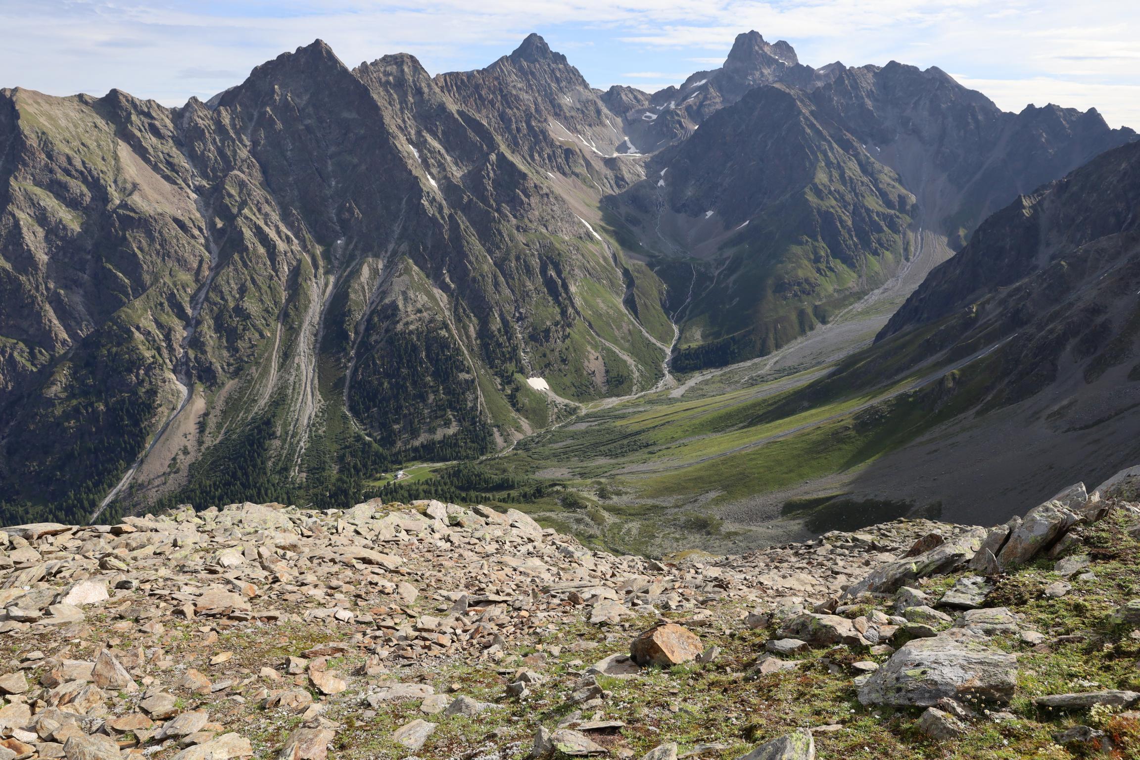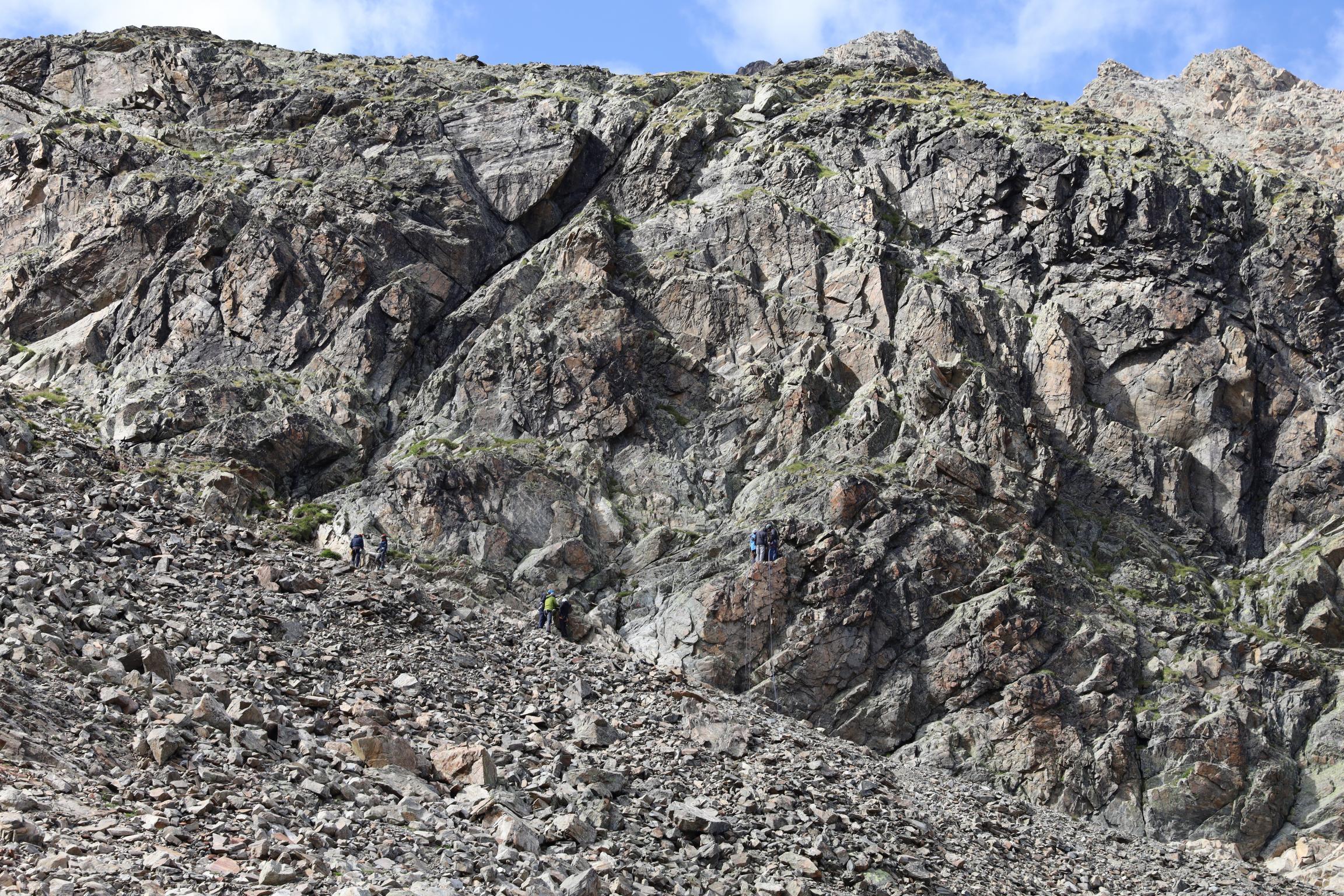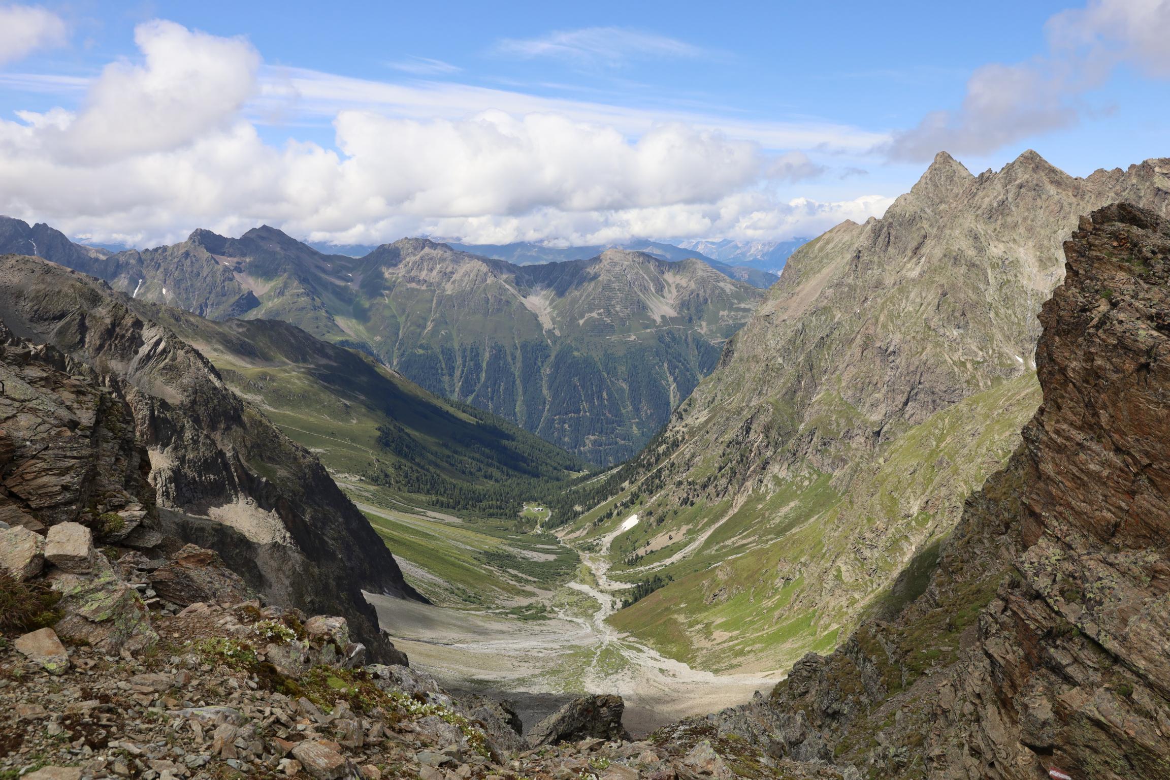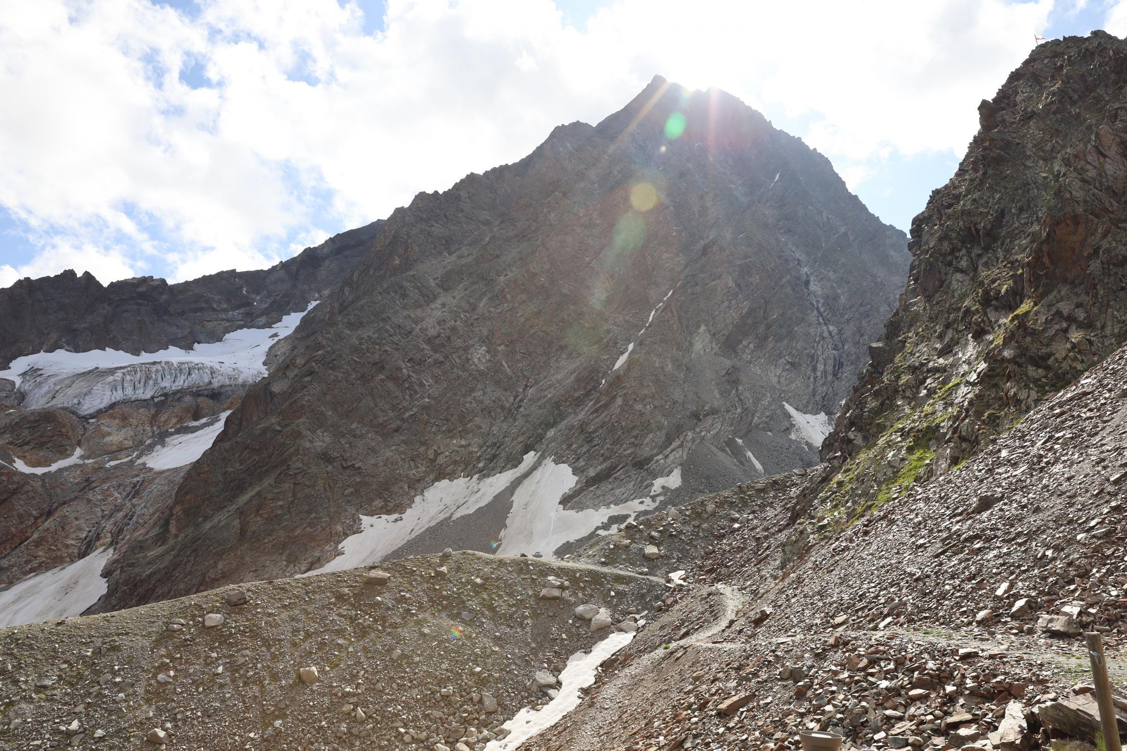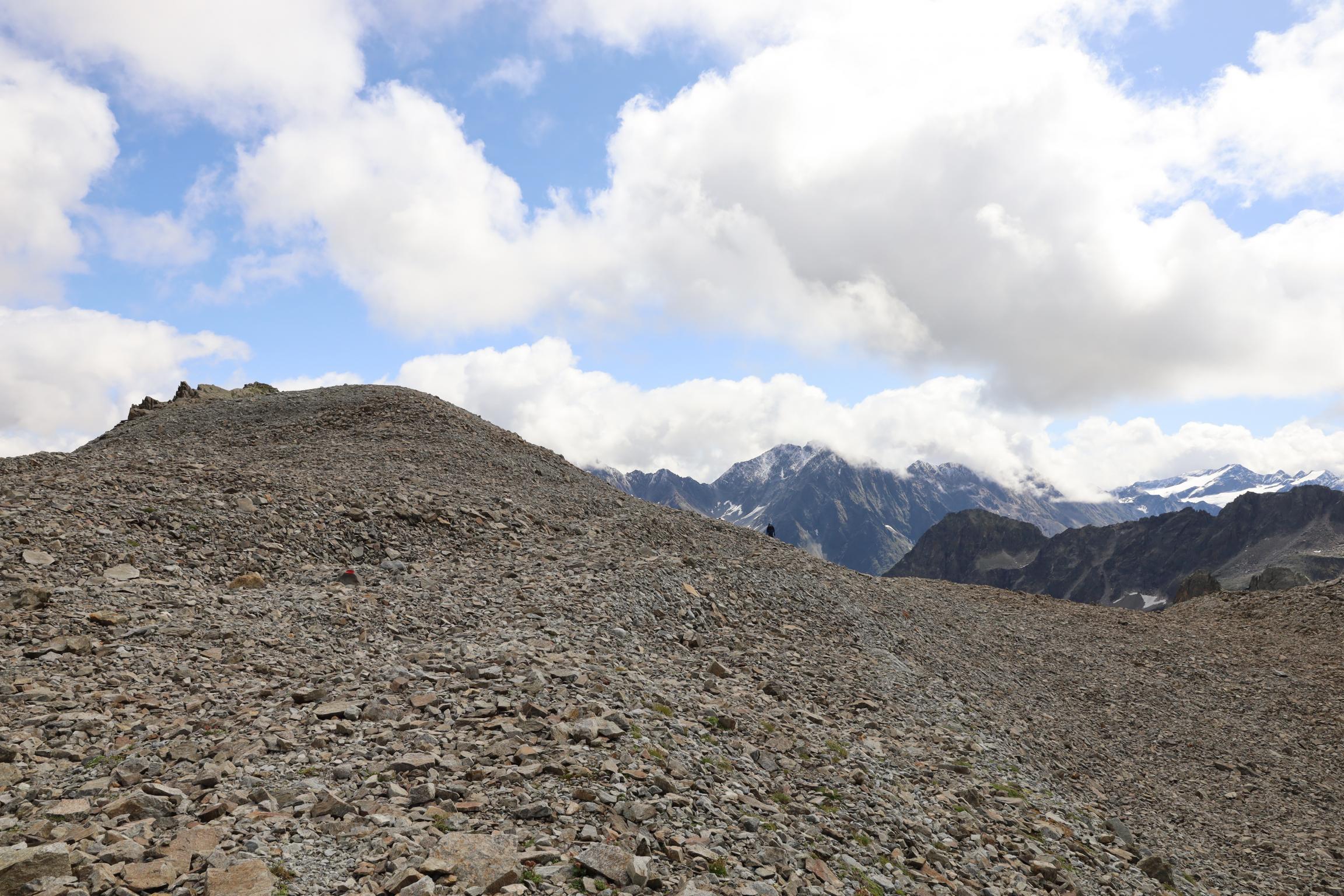 Am 16.08.19 sind wir um 06:30 Uhr aufgestanden bei 0 °C. Ich bin die Nacht jede Stunde wach geworden, weil mir immer die Decke weggerutscht ist und mich die Kälte geweckt hat. Um 08:30 Uhr sind wir nach dem Frühstück losgelaufen. Zunächst ging es nochmal gute 100 Höhenmeter bergauf über einen Steilhang zum Steinbockjoch. Dieser Übergang markiert mit 2940 m den höchsten Punkt auf unserer Tour. Der Weg (schwarze alpine Route) führte uns über Bäche, Bachläufe und Geröllfelder weiter zum Mittelberglesee auf 2450 m. Dieser ist auch von Trenkwald über eine rote Route erreichbar. Vom See haben wir das mächtige Verpeilmassiv gesehen und wussten am Verpeiljoch (2830 m) wartet noch jede Menge Kletterei auf uns. Der letzte Anstieg vor dem Joch war nochmal eine richtige Kraftprobe. Als Weg kann man ihn eigentlich nicht bezeichnen. Vom Joch aus hat man die Verpeilhütte in der Ferne gesehen. Allerdings war diese noch gute 2,5 Stunden entfernt. Die nächsten 300 m vom Verpeiljoch aus sind mit Tritten, Leitern und Seilen gesichert. Ich bin mit meiner Höhenangst gut auf meine Kosten gekommen. Allerdings ist die Route vorbildlich gesichert. Ein Klettersteigset ist nicht unbedingt erforderlich! Unterhalb der Verpeilspitze konnte man noch einen Blick auf den Gletscher bekommen. Zumindest konnte man vermuten, was alles mal Gletscher war – leider ist kaum noch was übrig! Um 15:30 Uhr sind wir nach 7 Stunden Wanderung auf der Verpeilhütte angekommen. Der Weg wurde offizell mit 6 Stunden angegeben, wir haben allerdings viele kleine Pausen gemacht und uns an der Landschaft erfreut. Auf der Hütte haben wir die letzten Sonnenstrahlen genossen und uns erstmal frisch gemacht. Nach dem Abendessen um 18:30 Uhr wurde Skat gespielt. Ich bin kurz vor der Nachruhe nochmal ins freie gegangen und habe die Sterne beobachtet. Durch die Perseiden konnte man auch noch die ein oder andere Sternschnuppe sehen.